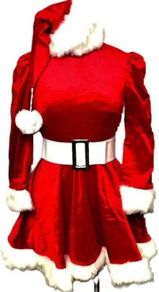 Made of red velour with long pull white plush trim. One piece dress includes: hat with large pom-pom and black vinyl belt with gilt buckle.