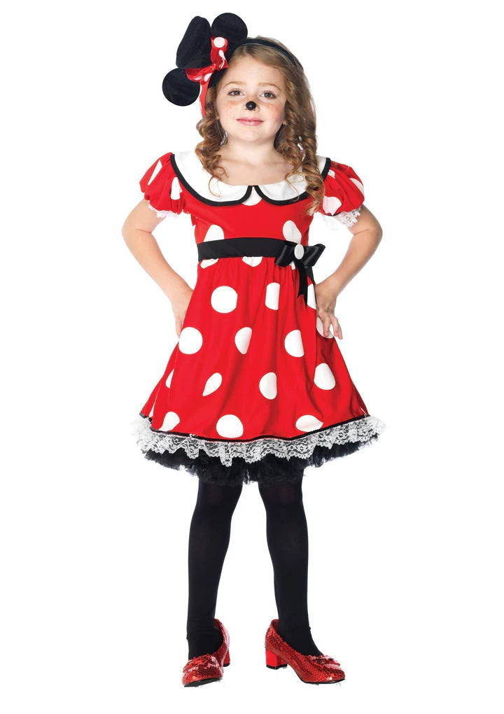 Get ready for a little mischief with this Adorable Miss Mischief costume! Includes red dress with white polka dots and collar, and a mousy headband!