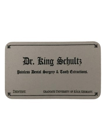 Replicate the charm of Dr. King Schultz, the enigmatic dentist from Quentin Tarantino's Django Unchained, with this movie prop business card. Featuring the inscription "Painless Dental Surgery & Tooth Extractions," this business card straight from the movie is a fun way to add a touch of cinematic flair to your collection.
