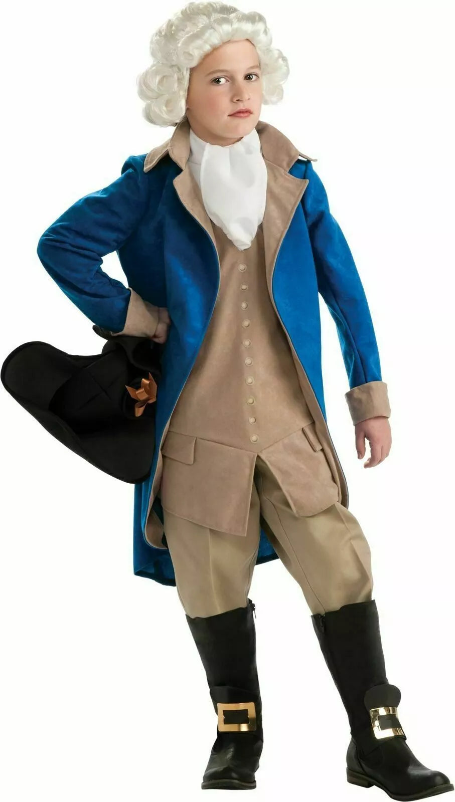 This deluxe child's George Washington costume is perfect for school projects, plays, and any patriotic occasion. It includes a blue tailcoat with tan lining, a long vest front with a white jabot, pants, and a tricorne hat. Let your child step back in time and experience history with this authentic-looking costume.