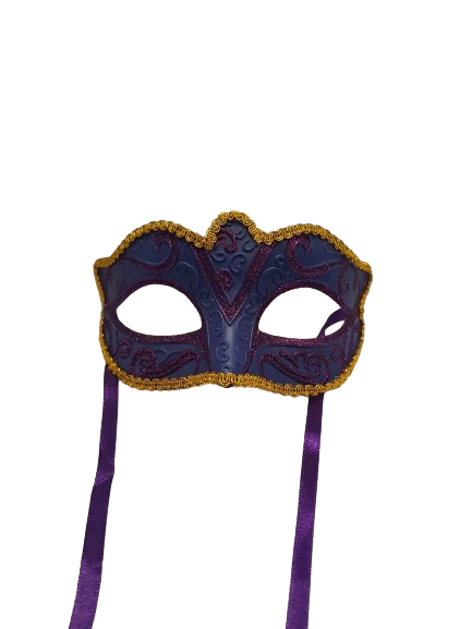 This captivating Venetian-style half-mask invites intrigue and mystery to any masquerade ball. Crafted from smooth, purple plastic, it shimmers with an alluring coating of deep purple glitter. The edges are adorned with delicate gold lace trim, adding a touch of elegance and sophistication.
